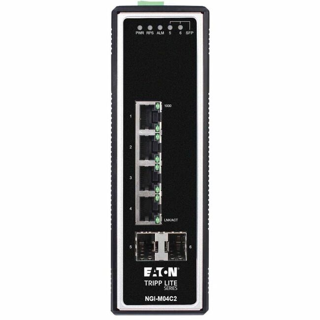 This space-saving Tripp Lite switch transmits data over a Gigabit Ethernet network. Four auto-negotiating 10/100/1000 Mbps ports send data via Cat5e/6/6a cable only to the devices designated to receive it which improves the efficiency and potential throughput of the network. The NGI-M04C2 also features two GbE SFP slots for uplinking data to other switches via optical fiber or copper. LEDs indicate when the switch is powered on and which Ethernet ports are showing activity.