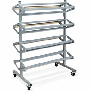 Mobile roll dispenser is designed for multi-roll paper dispensing. Capacity is eight 36" wide x 9" diameter rolls. All-steel roll dispenser is easy to assemble and comes with lockable casters. Steel features a powder-coat finish for durability. Paper is sold separately.